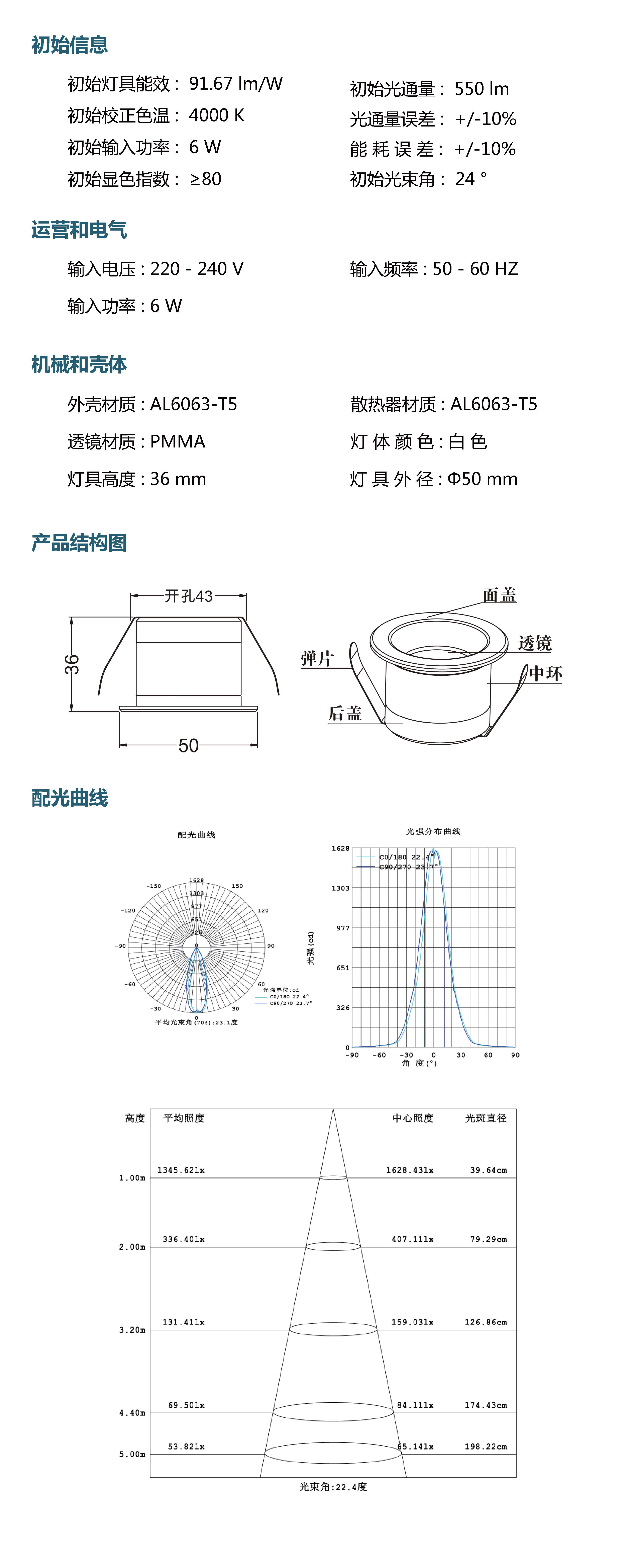 功 率: 6 W 光 通 量: 550 lm 中心照度: 410 lx (2m) 顯色指數(shù): ≥80 光 束 角: 24 ° 開孔尺寸: Ф43 mm