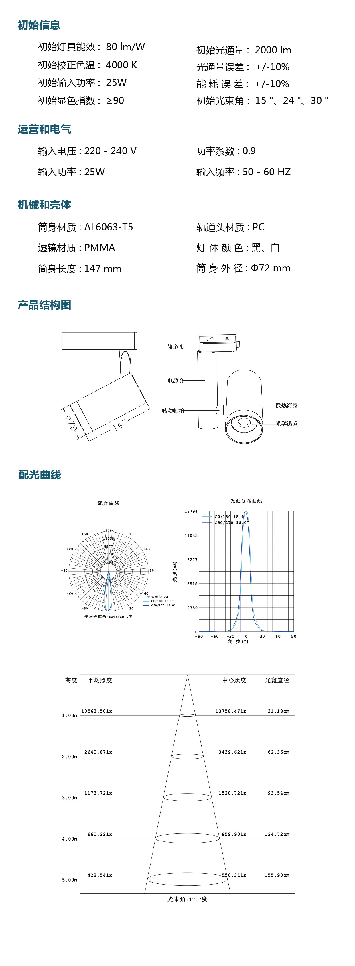 功 率: 25W 光 通 量: 2000 lm 中心照度: 3440 2020 lx 顯色指數(shù): ≥90 光 束 角: 15 °、24 °、30 °