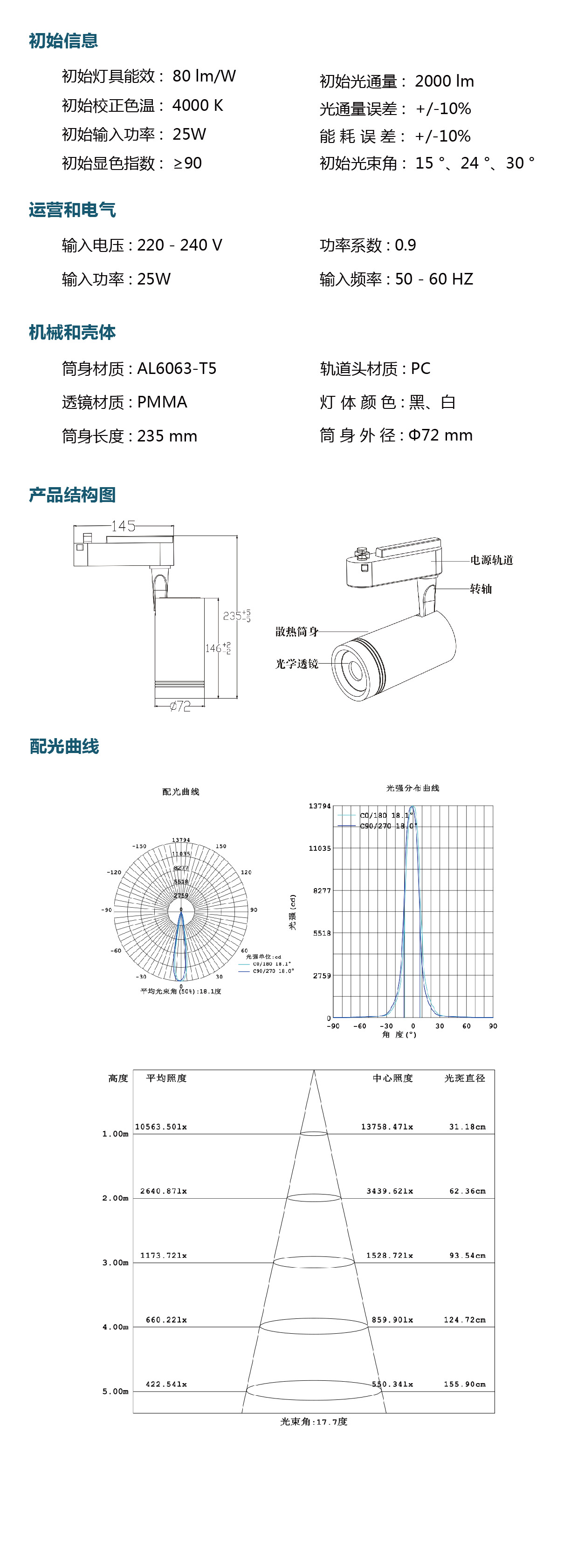 功 率: 25W 光 通 量: 2000 lm 中心照度: 3440 2020 lx 顯色指數(shù): ≥90